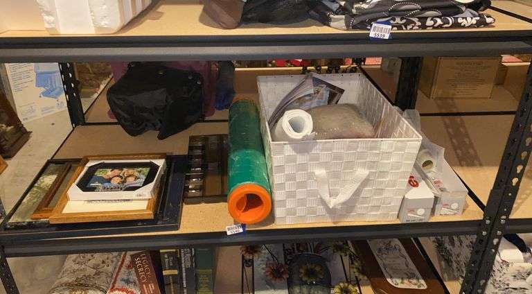 LOT 5540 - Contents of shelf: Wizard of Oz and other prints, craft supplies, shelf brackets, plastic wrap