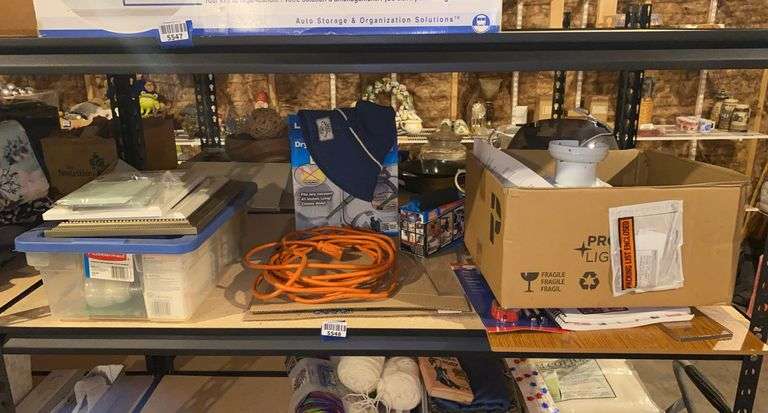 LOT 5548 - Contents of shelf: frames, lightbulbs, heavy duty extension cord, Lint Lizard, light fixture, Panasonic iron, misc