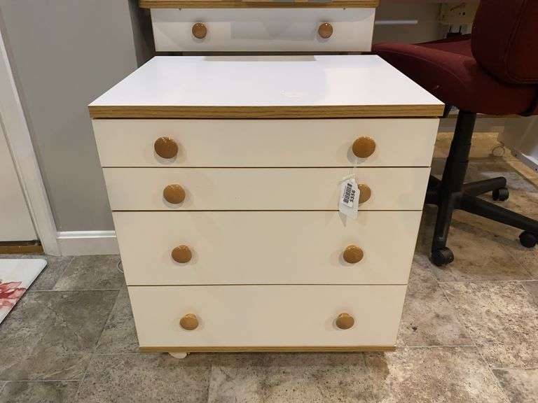 LOT 5556 - White chest of drawers w/ natural trim and knobs 22x18x24