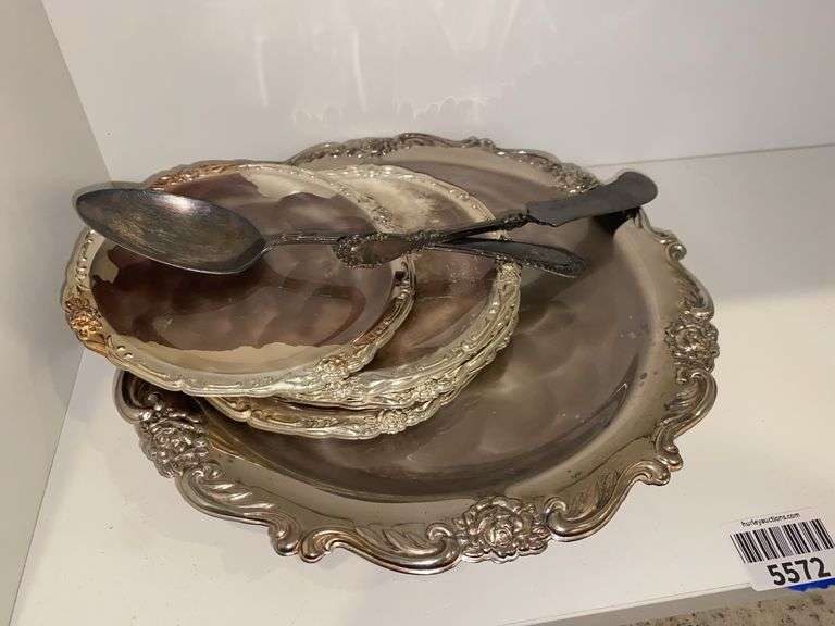 LOT 5572 - Silverplated butter knife and spoon, plates and tray