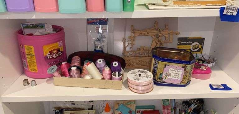 LOT 5582 - Contents of shelf: thimbles, thread, sewing supplies
