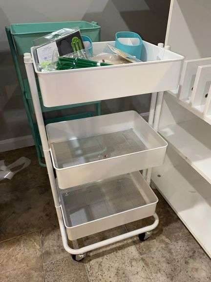 LOT 5599 - White rolling 3-tier cart w/ contents