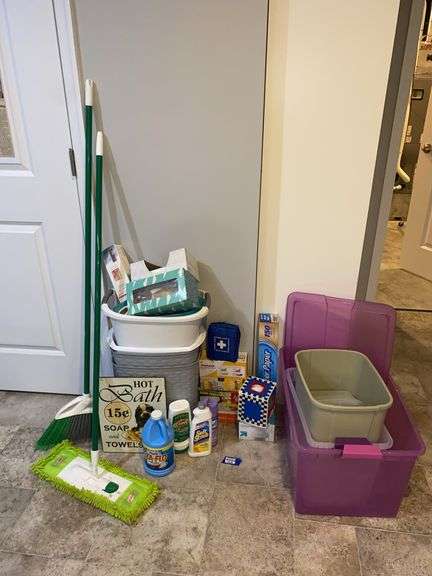 LOT 5606 - Dust mop, broom, cleaning products, waste cans, trash bags, plastic storage totes