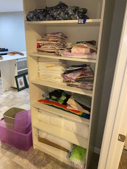 LOT 5608 - Contents of shelf unit: fabric and sewing supplies