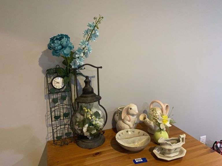 LOT 5610 - Decorative lantern, wire wall pocket clock, rabbit and watering can planters, divided dish and gravy boat, faux flowers