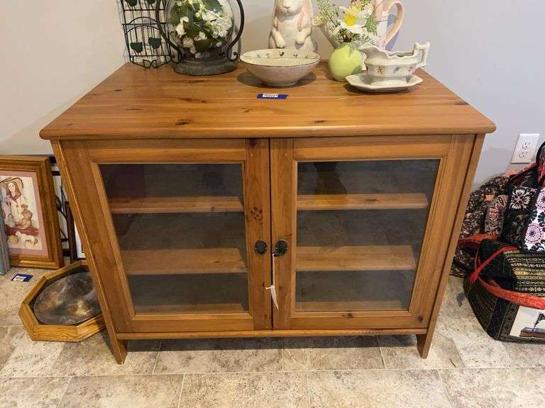 LOT 5611 - Knotty pine cabinet w/ two glazed doors - no contents 37.5x24.5x29.5