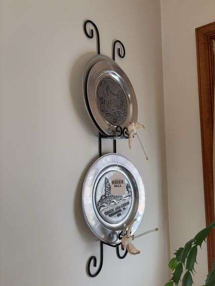 LOT 9611 - Three vintage Waynesboro metal souvenir plates and wire wall plate rack