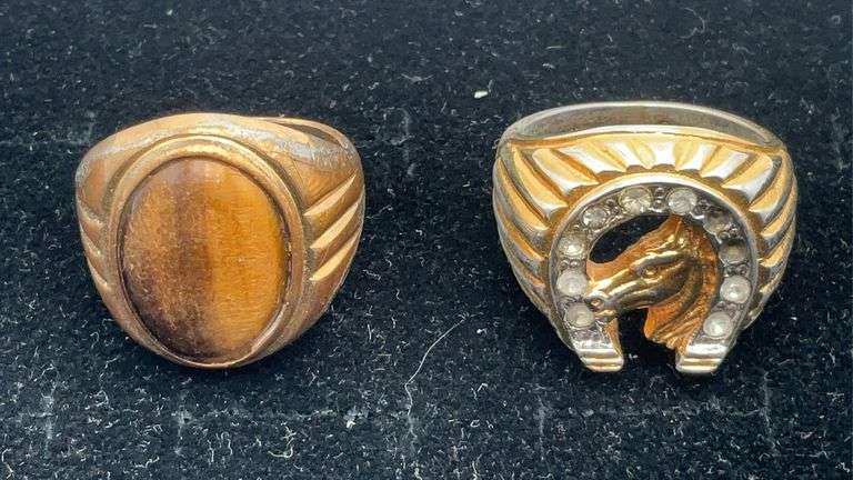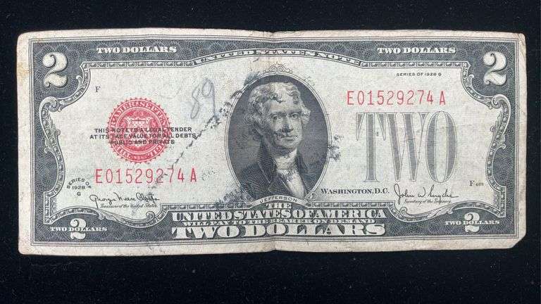 COINS/JEWELRY: Morgan & Peace silver dollars; Barber dime; Liberty nickel; red seal $2.00 bill; foreign coins; 14K ladies ring; men’s Fire Fighter rings; sterling ring & bracelet; costume jewelry;